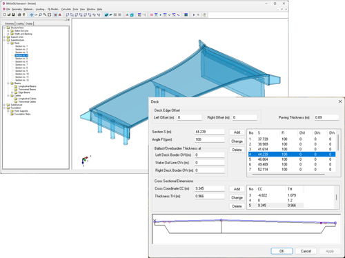 Bridges are typically defined parametrically through stake-out lines, span configurations, cross-sections, deck geometry, and support conditions. From these inputs, the software generates the structural model. In addition, these software most often also include predefined loads and analysis steps and load combinations required for bridge design.