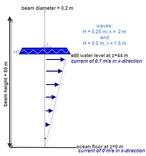 As example a circular beam with a diameter of 0.2 m and a length of 60 m is simulated. It is fixed to the ground and partially under water; the still water level is at 44 m. A current is specified in x-direction with a velocity of 0 at the ocean floor which increases linearly with height to 0.1 m/s at 44 m. Two sets of Airy waves are defined. One has a height of 0.25 m and a wavelength of 2 m. It travels in the x-direction. The other has a height of 0.2 m, a wavelength of 1.5 m and it travels at an angle of 45 degrees with respect to the x-axis in the x-y plane.