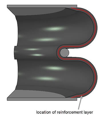 To model reinforcements, a layer of reinforcements is included in the middle of the thickness of the bellows (Figure 2). It includes fibres at an orientation of +/- 15 degrees with respect to the longitudinal direction. These are balanced, to maintain axisymmetry.