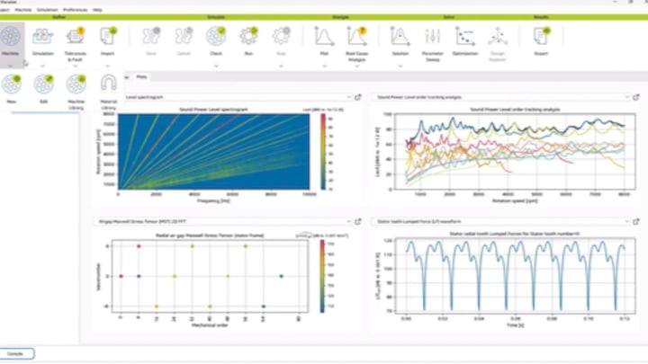 - Narzędzia do analizy przyczyn źródłowych: Oferuje dedykowane narzędzia do analizy przyczyn źródłowych hałasu i wibracji magnetycznych. Pozwala na identyfikację przyczyn elektrycznych i/lub mechanicznych, analizę wpływu różnych przypadków obciążenia (np. pulsacji momentu obrotowego) oraz oddzielenie hałasu pochodzącego ze stojana i wirnika.
