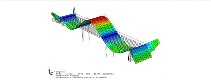 Dla przyjętej sztywności i masy konstrukcji oraz innych właściwości mostu, można obliczyć częstości własne (f) i postacie własne oraz kształt drgań konstrukcji.