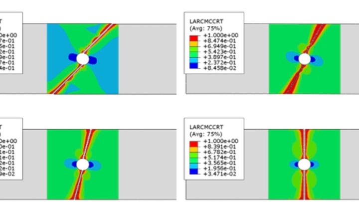 Symulacja dotyczy zniszczenia płytki kompozytowej z otworem poddanej jednoosiowemu rozciąganiu. W symulacji zastosowano ortotropowy sprężysty model materiału ze zniszczeniem LaRC05 [1]. Dostępne w Abaqus/Standard kryterium może być zastosowane do symulacji zachowania kompozytów jednokierunkowo wzmocnionych. Kryterium uwzględnia cztery różne mechanizmy inicjacji uszkodzenia (pękanie matrycy, zginanie włókien, rozdzielanie włókien i rozciąganie włókien). Do inicjacji i ewolucji pęknięć w materiale wykorzystano metodę XFEM [1, 2]. Uwzględniono cztery orientacje materiału kompozytowego (ORI-45, ORI-6-, ORI-75 i ORI-90). Rozkład naprężenia dla przypadku, w którym orientacja włókien jest pod kątem 45 stopni (ORI-45) przedstawiono na Rys. 1.