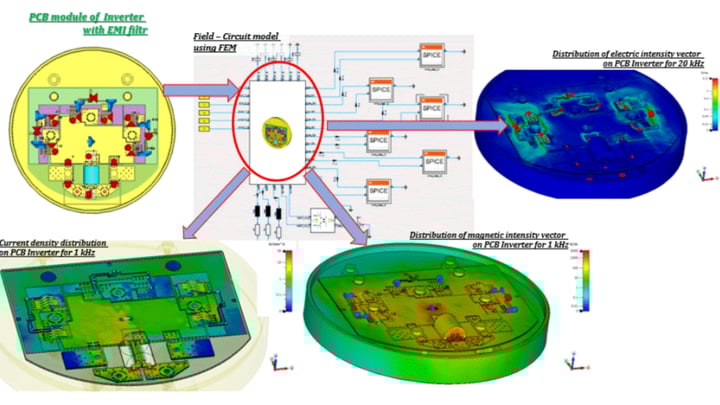 Poniżej przedstawiono wyniki przeprowadzonej w programie CST Studio Suite analizy porównawczej emisji przewodzonej EMC-CE dla 3-fazowego inwertera przewidzianego do pracy z wielobiegunowym silnikiem BLDC. Układ inwertora generuje trójfazowe sygnały o częstotliwości podstawowej równej 1 kHz oraz częstotliwości nośnej 20 kHz. Analizę porównawczą wykonano dla układu z zamontowanym filtrem EMI oraz bez. Na rysunku 1 przedstawiono widok modułu PCB układu inwertora wraz z zamontowanym filtrem EMI, jego schemat polowo-obwodowy oraz wybrane rozkłady, odpowiednio: (a) modułu wektora gęstości prądu odpowiadający harmonicznej podstawowej, (b) modułu wektora natężenia pola magnetycznego dla częstotliwości podstawowej oraz (c) modułu wektora natężenia pola elektrycznego dla częstotliwości nośnej.