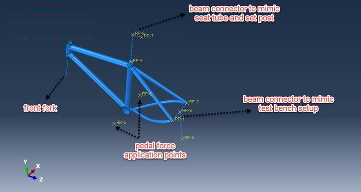 Punkty referencyjne RP-5 i RP-6 zostały umieszczone w określonej odległości od osi ramy i są połączone z suportem (gdzie przymocowane są korby i pedały). Te punkty referencyjne będą używane do przyłożenia sił lewego i prawego pedału.